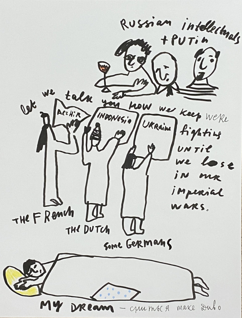 Alevtina Kakhidze A Dream Of A Ukrainian / My dream Year 2022 Medium Ink and color pencil on paper Dimensions 289 x 210 mm About the work Since the outbreak of Russia’s war of aggression against Ukraine on 22 February 2022, Ukrainian artist Alevtina Kakhidze has drawn wide public interest thanks to the critically annotated, diary-like drawings posted on her Instagram account @truealevtina. The War Diaries drawings contain quickly sketched scenarios combined with elucidating notes. They comment on her day-to-day experience during the war, living under the constant threat of missile strikes and without electricity or central heating, as well as global political discussions. Employing both humour and critical analysis, they reflect on how Ukraine is portrayed by Russia and how Russia is portrayed by Ukraine. Date and country of birth 1973, UA Career Highlights Exhibitions in 2023: Signs of Peaceful Life, Meyer Riegger Gallery, Berlin; Génération de femmes et de plantes, Ambassade d’Ukraine en France, Paris; Kaleidoscope of (Hi)stories. Ukrainian Art 1912–2023, Albertinum, Staatlich Kunstsammlungen, Dresden; Dialogues – EuroFestival, Bluecoat, Liverpool; Parliament Of Plants II, Kunstmuseum Liechtenstein, Vaduz; Le monde est rond, Galerie Nadja Vilenne, Liege, Belgium Collections: SCHUNCK Art Collection, Telekom hCollection, M HKA, Antwerp, Collection Flemish Community, Le Frac des Pays, KOLEKCJA II, Mystetskyi Arsenal National Art and Culture Museum Complex, Kyiv, Ukraine, NAMU: National Art Museum of Ukraine, Kyiv, Ukraine, Grynyov Art Collection.