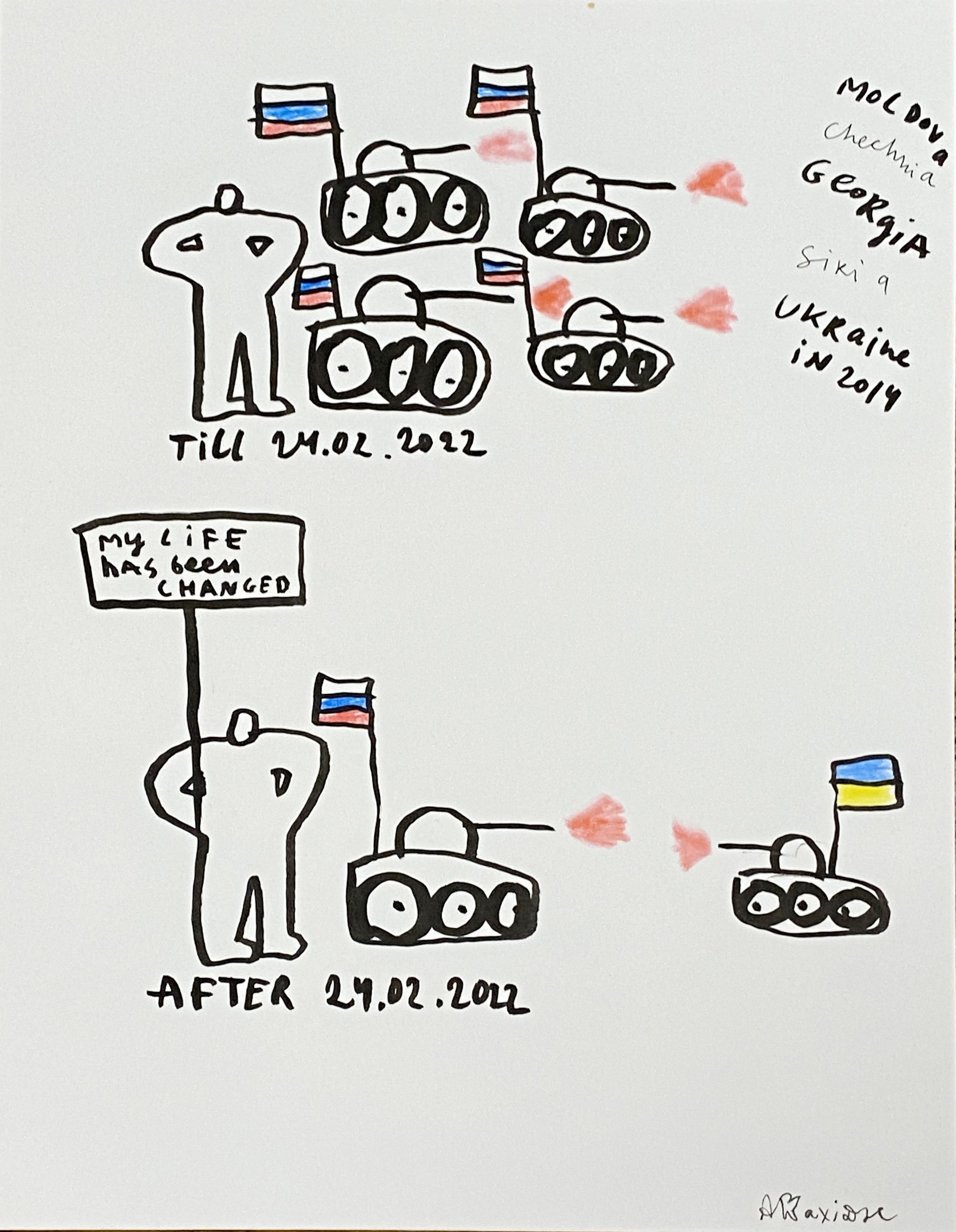 Alevtina Kakhidze Russian Artists Year 2022 Medium drawings on paper, ink with color pencil Dimensions 290x210 About the work Since the outbreak of Russia’s war of aggression against Ukraine on 22 February 2022, Ukrainian artist Alevtina Kakhidze has drawn wide public interest thanks to the critically annotated, diary-like drawings posted on her Instagram account @truealevtina. The War Diaries drawings contain quickly sketched scenarios combined with elucidating notes. They comment on her day-to-day experience during the war, living under the constant threat of missile strikes and without electricity or central heating, as well as global political discussions. Employing both humour and critical analysis, they reflect on how Ukraine is portrayed by Russia and how Russia is portrayed by Ukraine. Date and country of birth 1973, UA Career Highlights Exhibitions in 2023: Signs of Peaceful Life, Meyer Riegger Gallery, Berlin Génération de femmes et de plantes, Ambassade d’Ukraine en France, Paris Kaleidoscope of (Hi)stories. Ukrainian Art 1912–2023, Albertinum, Staatlich Kunstsammlungen, Dresden Dialogues – EuroFestival, Bluecoat, Liverpool Parliament Of Plants II, Kunstmuseum Liechtenstein, Vaduz Le monde est rond, Galerie Nadja Vilenne, Liege, Belgium Collections: SCHUNCK https://www.schunck.nl, Art Collection Telekom https://www.art-collection-telekom.com, Collection M HKA, Antwerp / Collection Flemish Community https://www.muhka.be Le Frac des Pays https://fracdespaysdelaloire.com/ KOLEKCJA II https://galeria-arsenal.pl, Mystetskyi Arsenal National Art and Culture Museum Complex, Kyiv, Ukraine, NAMU: National Art Museum of Ukraine, Kyiv, Ukraine Grynyov Art Collection http://grynyov.art/about