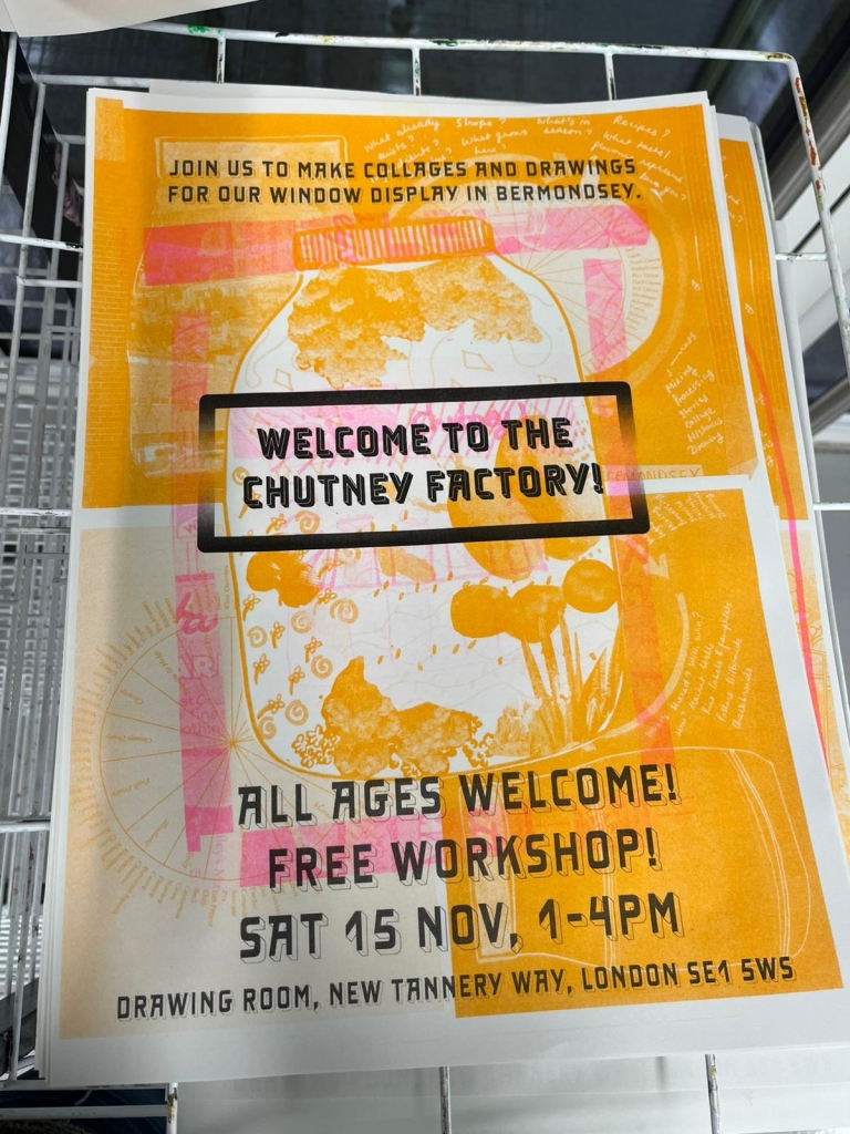 Drawing Things Together Welcome to the Chutney Factory Mix. Make. Imagine. 15 November 2025, 1pm-4pm Back WhatsApp Image 2025-10-30 at 19.48.00 Location Community Studio Step through the factory doors of our Community Studio and help to make our latest batch! Join us to make drawings and collages for our factory inspired window installation! Everyone’s invited! This is a free, drop-in workshop — open to all ages. Friends, families, neighbours. Pop in any time between 1pm–4 pm to take part in the factory! The Chutney Factory is part of Drawing Things Together — a community art project led by artists Ishwari Bhalerao and Leonie Rousham (Kneed). Through storytelling, food, art and printing, we’ll transform your ideas, drawings and recipes into a real chutney — and a zine made using our community Risograph printer! So roll up your sleeves, step into the factory! Projects: Drawing Things Together Welcome to the Chutney Factory Mix. Make. Imagine. 15 November 2025, 1pm-4pm Reserve Your Place ROCK PAPER SCISSORS Family Studio Leonie Rousham 2 November 2025, 12pm-1.45pm or 2.15pm-4pm Drawing Things Together Let’s Make The Best Chutney in the World Half Term Fun! 29 October 2025, 12pm-4pm Drawing Things Together Community Day – Tastes of our neighbourhood Tasting local ingredients, drawing and writing to create a sensory map of the area 20 September 2025, 12pm to 3pm