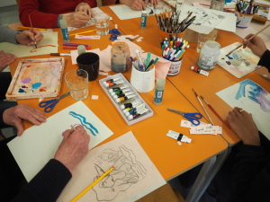 Sessions begin with a collaborative drawing exercise to invite people to make a mark that is not just their own, and from this, discover new marks and imagery that can become a starting point for something new. The process of collaboration invites creative freedom as well as an opening for self-compassion. Each session introduces new processes and the opportunity to learn a new skill as well as nurturing the time for an individual to be present with a process or material. The displaying of work, if only momentary, offers everybody the opportunity to look and celebrate what has been created and discovered that day.
