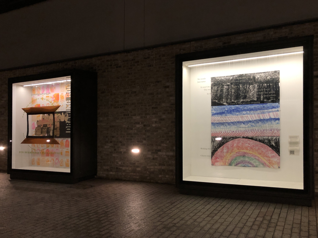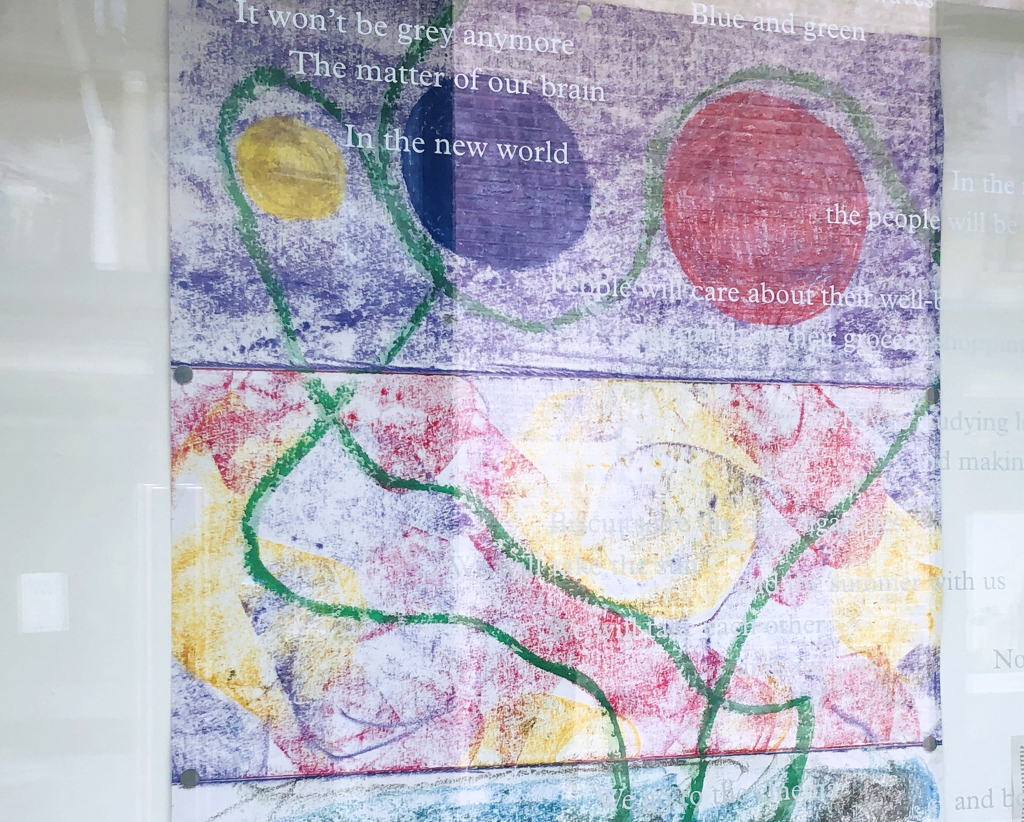Outside the gallery in the vitrine, a rotating display of drawings and writing, inspired by the Surrealist game, Cadavre Exquis, where a page is folded into 3 or 4 parts and passed along the table, resulting in an image or poem that is collectively assembled. Here, the drawings and poem all follow this method of making together and represent the voices and imaginations of the service users.