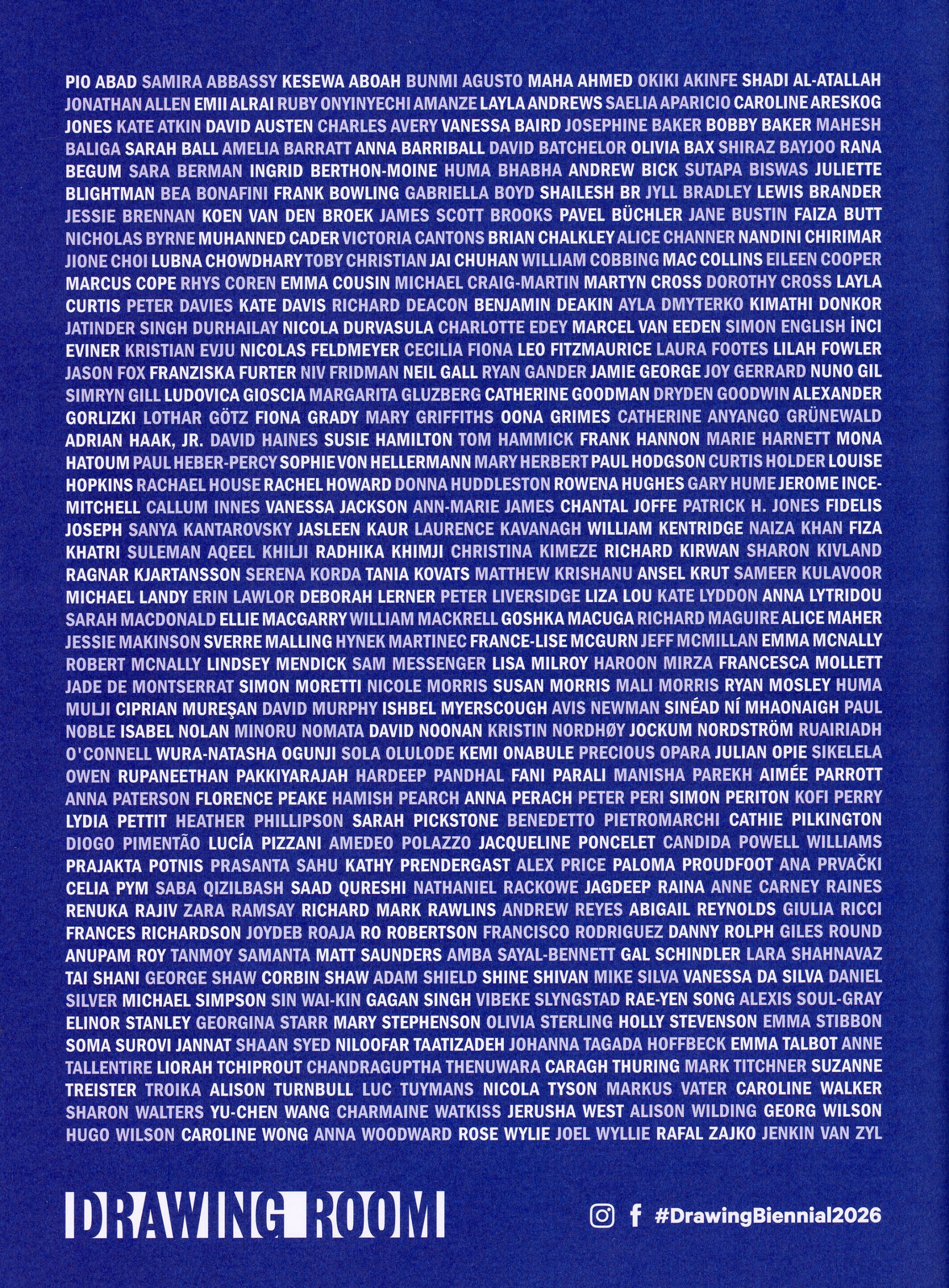 Drawing Biennial 2026 includes artworks by Pio Abad, Samira Abbassy, Kesewa Aboah, Maha Ahmed, Bunmi Agusto, Okiki Akinfe, Shadi Al-Atallah, Jonathan Allen, Emii Alrai, ruby onyinyechi amanze, Layla Andrews, Saelia Aparicio, Caroline AreskogJones, Kate Atkin, David Austen, Charles Avery, Vanessa Baird, Bobby Baker, Josephine Baker, Mahesh Baliga, Sarah Ball, Amelia Barratt, Anna Barriball, David Batchelor, Olivia Bax, Shiraz Bayjoo, Rana Begum, Sara Berman, Ingrid Berthon-Moine, Huma Bhabha, Andrew Bick, Sutapa Biswas, Juliette Blightman, Bea Bonafini, Frank Bowling, Gabriella Boyd, Shailesh BR, Jyll Bradley, Lewis Brander, Jessie Brennan, Koen van den Broek, James Scott Brooks, Pavel Büchler, Jane Bustin, Faiza Butt, Nicholas Byrne, Muhanned Cader, Victoria Cantons, Alice Channer, Brian Dawn Chalkley, Nandini Chirimar, Jione Choi, Lubna Chowdhary, Toby Christian, Jai Chuhan, William Cobbing, Mac Collins, Eileen Cooper, Marcus Cope, Rhys Coren, Emma Cousin, Michael Craig-Martin, Dorothy Cross, Martyn Cross, Layla Curtis, Peter Davies, Kate Davis, Richard Deacon, Benjamin Deakin, Alya Dmyterko, Kimathi Donkor, Jatinder Singh Durhailay, Nicola Durvasula, Charlotte Edey, Marcel van Eeden, Simon English, İnci Eviner, Kristian Evju, Nicolas Feldmeyer, Cecilia Fiona, Leo Fitzmaurice, Laura Footes, Jason Fox, Lilah Fowler, Niv Fridman, Franziska Furter, Neil Gall, Ryan Gander, Jamie George, Joy Gerrard, Nuno Gil, Simryn Gill, Ludovica Gioscia, Margarita Gluzberg RA, Catherine Goodman, Dryden Goodwin, Alexander Gorlizki, Lothar Götz, Fiona Grady, Mary Griffiths, Oona Grimes, Catherine Anyango Grünewald, Adrian Haak, Jr., David Haines, Susie Hamilton, Tom Hammick, Frank Hannon, Marie Harnett, Mona Hatoum, Sophie von Hellermann, Paul Heber-Percy, Mary Herbert, Paul Hodgson, Curtis Holder, Louise Hopkins, Rachael House, Rachel Howard, Donna Huddleston, Rowena Hughes, Gary Hume, Jerome, Callum Innes, Vanessa Jackson, Ann-Marie James, Soma Surovi Jannat, Chantal Joffe, Patrick H. Jones, Fidelis Joseph, Sanya Kantarovsky, Jasleen Kaur, Laurence Kavanagh, William Kentridge, Naiza Khan, Fiza Khatri, Suleman Aqeel Khilji, Radhika Khimji, Christina Kimeze, Richard Kirwan, Sharon Kivland, Ragnar Kjartansson, Serena Korda, Tania Kovats, Matthew Krishanu, Ansel Krut, Sameer Kulavoor, Michael Landy, Erin Lawlor, Deborah Lerner, Peter Liversidge, Liza Lou, Kate Lyddon, Anna Lytridou, Sarah Macdonald, Ellie MacGarry, William Mackrell, Goshka Macuga, Richard Maguire, Alice Maher, Jessie Makinson, Sverre Malling, Hynek Martinec, France-Lise McGurn, Jeff McMillan, Emma McNally, Robert McNally, Lindsey Mendick, Sam Messenger, Lisa Milroy, Haroon Mirza, Francesca Mollett, Jade de Montserrat, Simon Moretti, Mali Morris, Nicole Morris, Susan Morris, Ryan Mosley, Huma Mulji, Ciprian Mureşan, David Murphy, Ishbel Myerscough, Avis Newman, Sinéad Ní Mhaonaigh, Paul Noble, Isabel Nolan, Minoru Nomata, David Noonan, Kristin Nordhøy, Jockum Nordström, Ruairiadh O’Connell, Wura-Natasha Ogunji, Sola Olulode, Kemi Onabule, Precious Opara, Julian Opie, Sikelela Owen, Rupaneethan Pakkiyarajah, Hardeep Pandhal, Fani Parali, Manisha Parekh, Aimée Parrott, Anna Paterson, Florence Peake, Hamish Pearch, Anna Perach, Peter Peri, Simon Periton, Kofi Perry, Lydia Pettit, Heather Phillipson, Sarah Pickstone, Benedetto Pietromarchi, Cathie Pilkington, Diogo Pimentão, Lucía Pizzani, Amedeo Polazzo, Jacqueline Poncelet, Prajakta Potnis, Candida Powell Williams, Kathy Prendergast, Alex Price, Paloma Proudfoot, Ana Prvački, Celia Pym, Saba Qizilbash, Saad Qureshi, Nathaniel Rackowe, Jagdeep Raina, Anne Carney Raines, Renuka Rajiv, Zara Ramsay, Richard Mark Rawlins, Andrew Reyes, Abigail Reynolds, Giulia Ricci, Frances Richardson, Joydeb Roaja, Ro Robertson, Francisco Rodríguez, Danny Rolph, Giles Round, Anupam Roy, Prasanta Sahu, Tanmoy Samanta, Matt Saunders, Amba Sayal-Bennett, Gal Schindler, Lara Shahnavaz, Tai Shani, Corbin Shaw, George Shaw, Adam Shield, Shine Shivan, Mike Silva, Vanessa da Silva, Daniel Silver, Michael Simpson, Sin Wai Kin, Gagan Singh, Vibeke Slyngstad, Rae-Yen Song, Alexis Soul-Gray, Elinor Stanley, Georgina Starr, Mary Stephenson, Olivia Sterling, Holly Stevenson, Emma Stibbon, Shaan Syed, Niloofar Taatizadeh, Emma Talbot, Johanna Tagada Hoffbeck, Anne Tallentire, Liorah Tchiprout, Chandraguptha Thenuwara, Caragh Thuring, Mark Titchner, Suzanne Treister, Troika, Alison Turnbull, Luc Tuymans, Nicola Tyson, Markus Vater, Caroline Walker, Sharon Walters, Yu-Chen Wang, Charmaine Watkiss, Jerusha West, Alison Wilding, Georg Wilson, Hugo Wilson, Anna Woodward, Caroline Wong, Rose Wylie, Joel Wyllie, Rafal Zajko and Jenkin van Zyl.