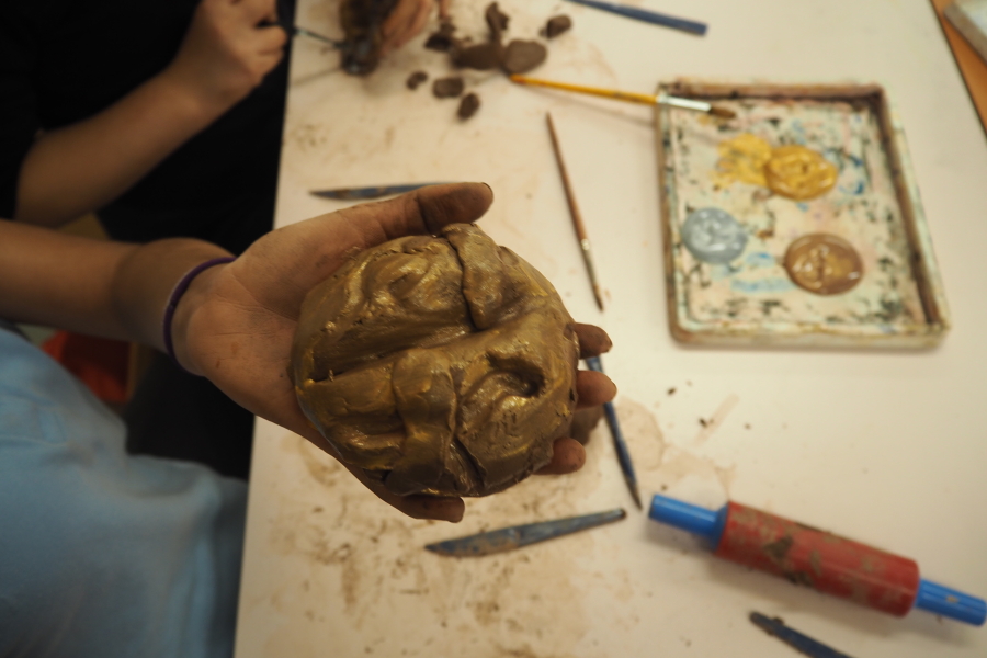 Using clay, mark-making tools, and metallic paints, the children pressed, carved, and layered textures, experimenting with grooves, ripples, and flowing lines. The metallic paints highlighted the shadows and raised areas, giving each piece depth and a sculptural presence reminiscent of Iglesias’ bronze works.