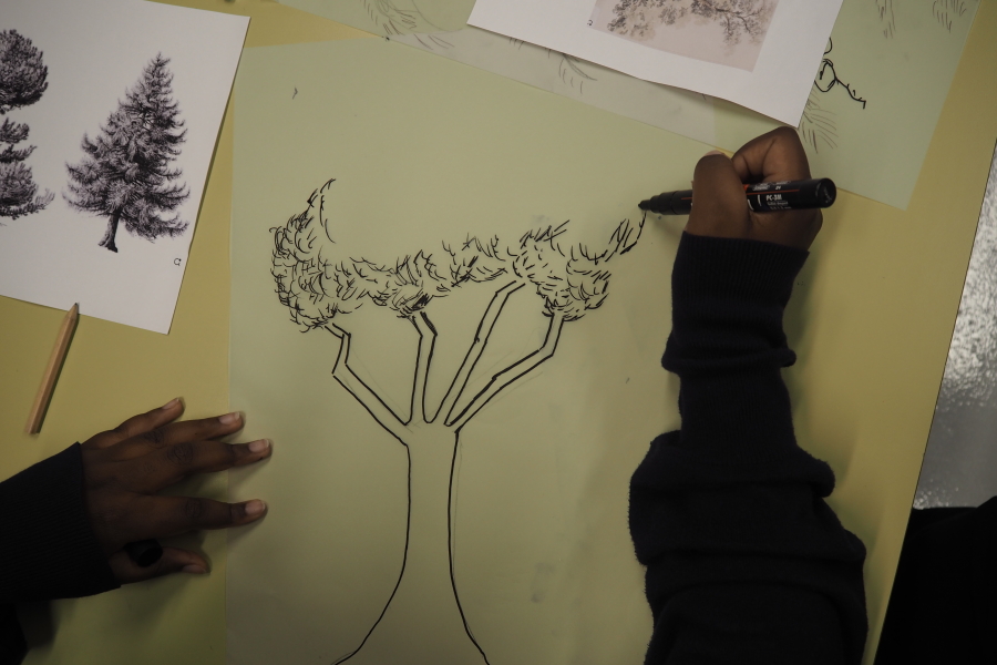 Using soft pastels, charcoal, pens and tracing paper, the children created tree studies with sweeping trunks, swirling branches, and abstract nature-inspired marks and rubbings. Working together, the children layered elements from each other’s drawings, creating vibrant, textured treescapes. Their drawings became the foundation for collaborative Riso prints. The Riso process, with its rich colours and slightly imperfect, organic quality, brought the compositions to life.